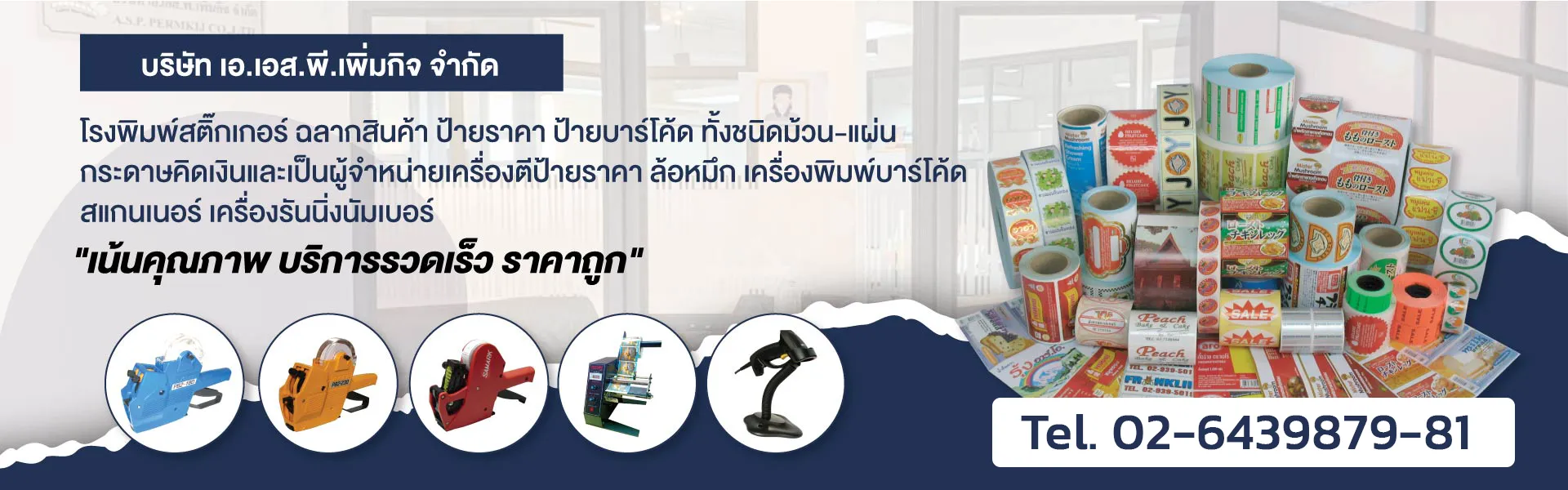 บริษัทฯ เป็นโรงพิมพ์ ผลิตสติ๊กเกอร์ ฉลากสินค้า ป้ายราคา ป้ายบาร์โค้ด ทั้งชนิดม้วน-แผ่น และเป็นผู้จำหน่ายเครื่องพิมพ์บาร์โค้ด เครื่องตีป้ายราคา-ล้อหมึก เครื่องรันนิ่งนัมเบอร์