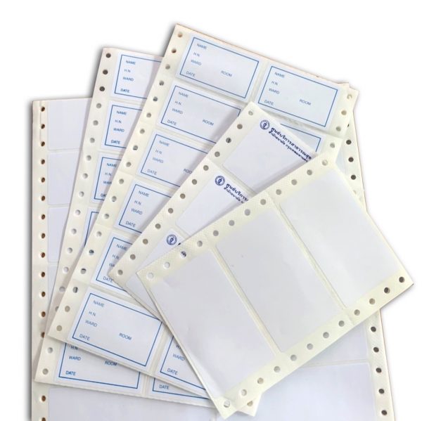 รับผลิตสติ๊กเกอร์เจาะรูหนามเตย พิมพ์ได้หลายสี สำหรับพิมพ์บนเครื่อง Dot Matrix สติ๊กเกอร์ดวงเปล่า, และ งานเจาะรูคอม สติ๊กเกอร์โรงพยาบาล, ศูนย์บริการสาธารณสุข Sticker Direct Thermal ออกแบบและไดคัท ตามความต้องการของลูกค้า